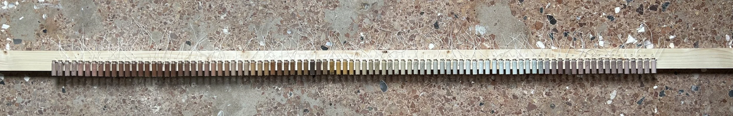 The color studies presented here are made with pigment extensions of the Ochre bodies presented on the adjacent structure. (Table 1.) The mini vials contain samples of each entry in the List of Pigments (Index Sheet) prepared in FSGS Community Operations. (Table 3.)